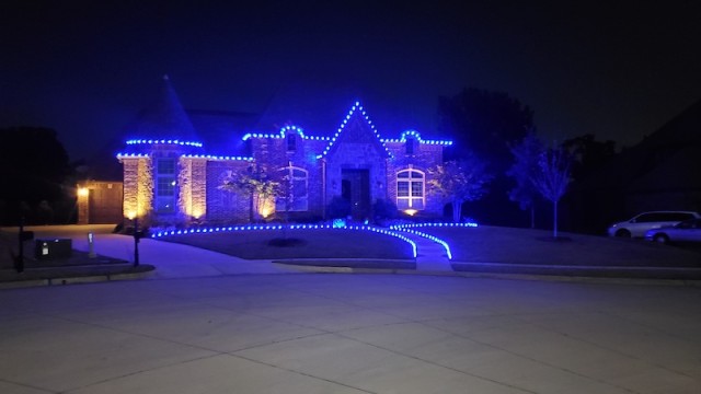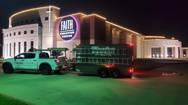 At Patriot Services, our lights are custom fit to your home, and in almost all cases, can be all powered up by one power line. Our power lines are small and we do our best to hide them; we want your home or business to look as good in the day as it does at night!
